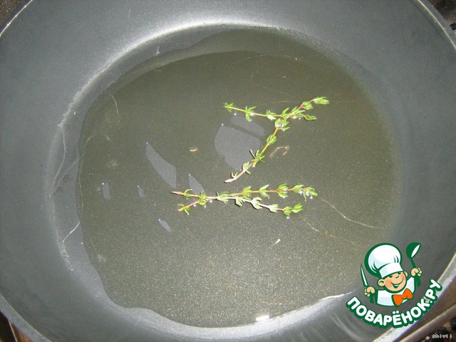 Теперь подощло время и для печенки. Разогреваем на сковороде оливковое масло, бросаем в него на полминутки пару веточек тимьяна. Со свежим, конечно, ароматней, но за неимением можно взять и сухой.