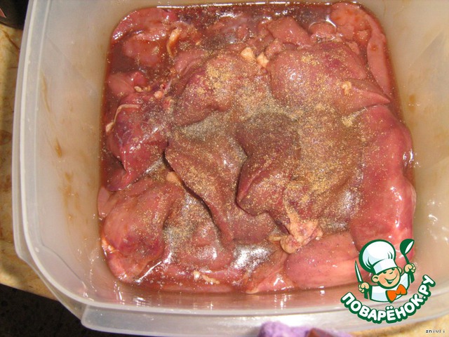 Сначала подготавливаем печень. Хорошенько промываем, солим по вкусу и смешиваем с соусами: терияки и чили, добавляем вино и кусбару.