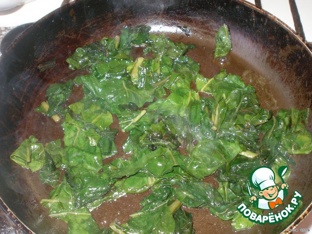 Нарезаем небольшими кусочками сельдерей и добавляем его к шпинату. Готовим еще 2-3 минуты. Солим.