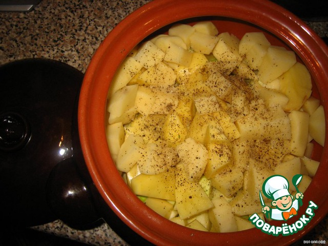 Выкладываем мясо (предварительно я его замочила в маринаде: чеснок + перец + соль + соевый соус "Кикоман").
