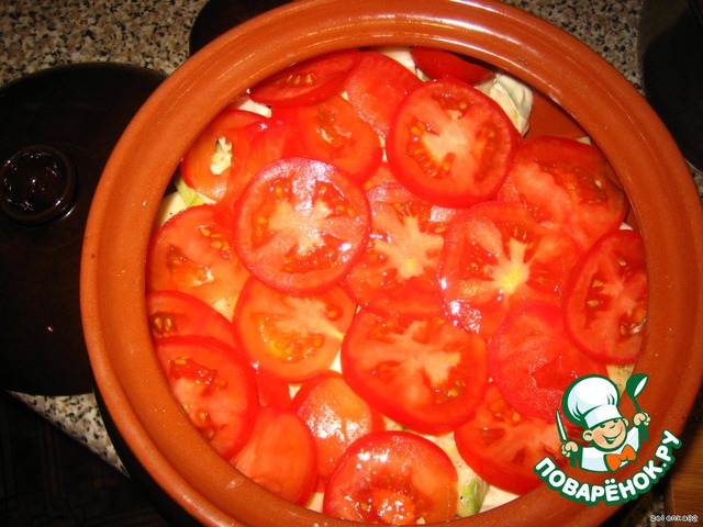 Выкладываем порезанные кружочками помидоры, желательно без кожицы (мне было лень).