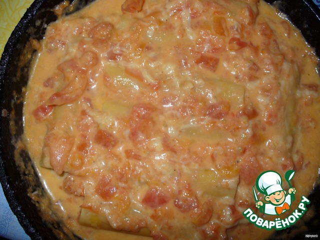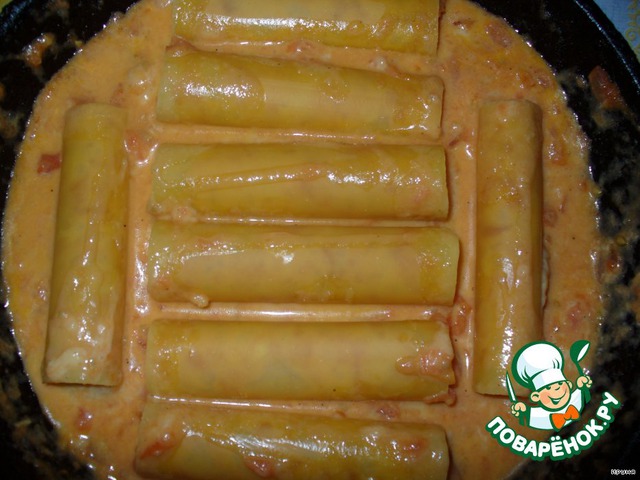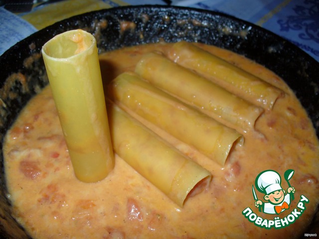 Часть томатной массы положить в форму для запекания (или сковороду), чтобы всё дно было закрыто. Нафаршировать каннеллони помидорно-сырной массой. Я это делаю в этой же форме, что если что-нибудь вытекает, то прямо в форму.