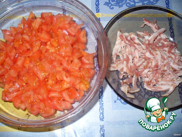 Помидоры обдать кипятком, потом сразу холодной водой. Очистить от кожицы и нарезать кубиками. Бекон нарезать полосками.