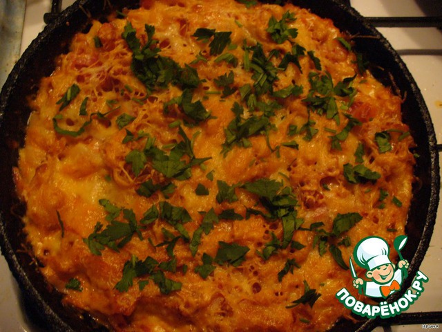 Дать чуть-чуть постоять (чтобы "схатилось" и удобнее было резать). Посыпать рубленой зеленью. Разрезать на порции и подавать на стол. По этому же принципу я делаю лазанью - укладываю слоями помидорно-сырную массу, бекон и листы лазаньи, сверху - тертый сыр.