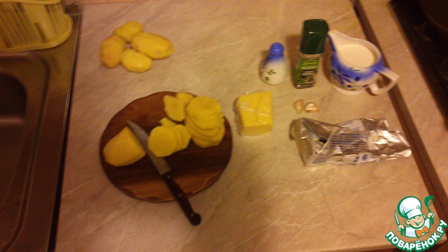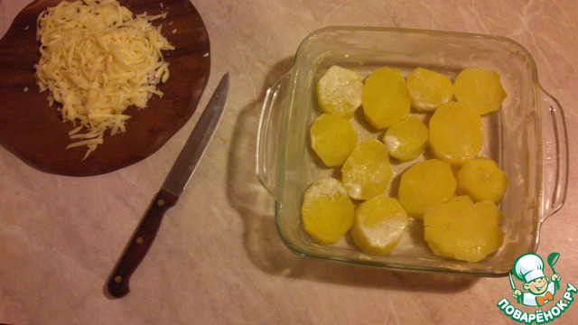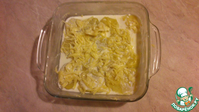 6. Еще один слой картошки, сыра и сливок. Залейте немного молока, в котором готовился картофель.
