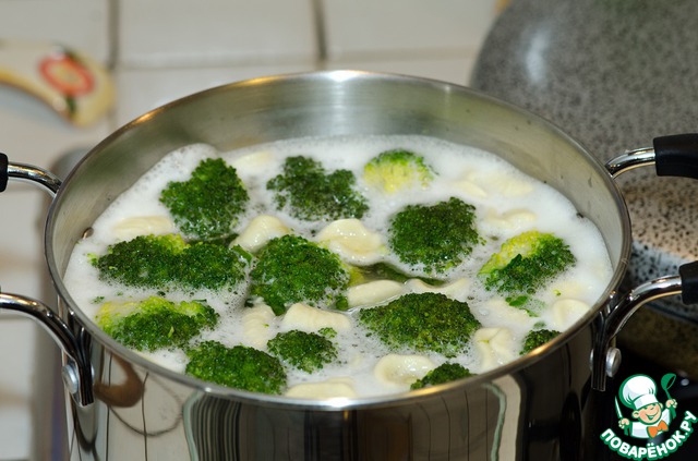 В кипящую воду помещаем пасту и брокколи вместе и варим до готовности (около 10 минут).