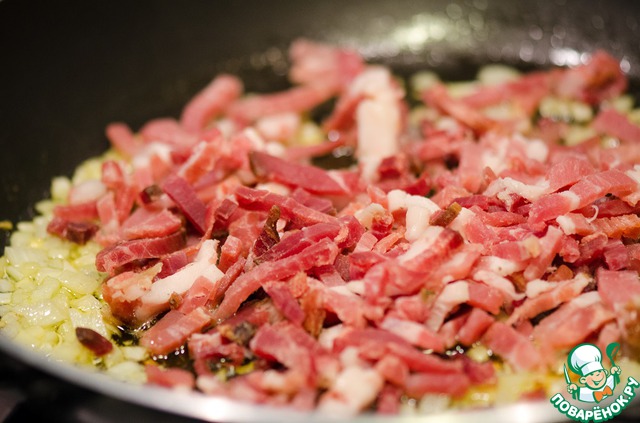 Тем временем жарим лук на оливковом масле, затем добавляем к нему мелко нарезанную корейку (я использовала в упаковке, нарезанную соломкой) и продолжаем жарить минут 5.
