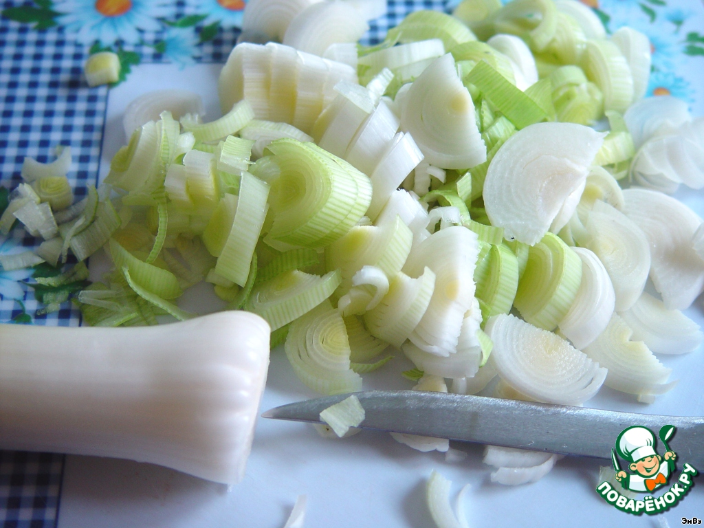 Снимаем крышку, выпариваем жидкость, если она остается, и добавляем 1/3 лука-порея, опять накрываем, оставляем на огне до готовности лука.