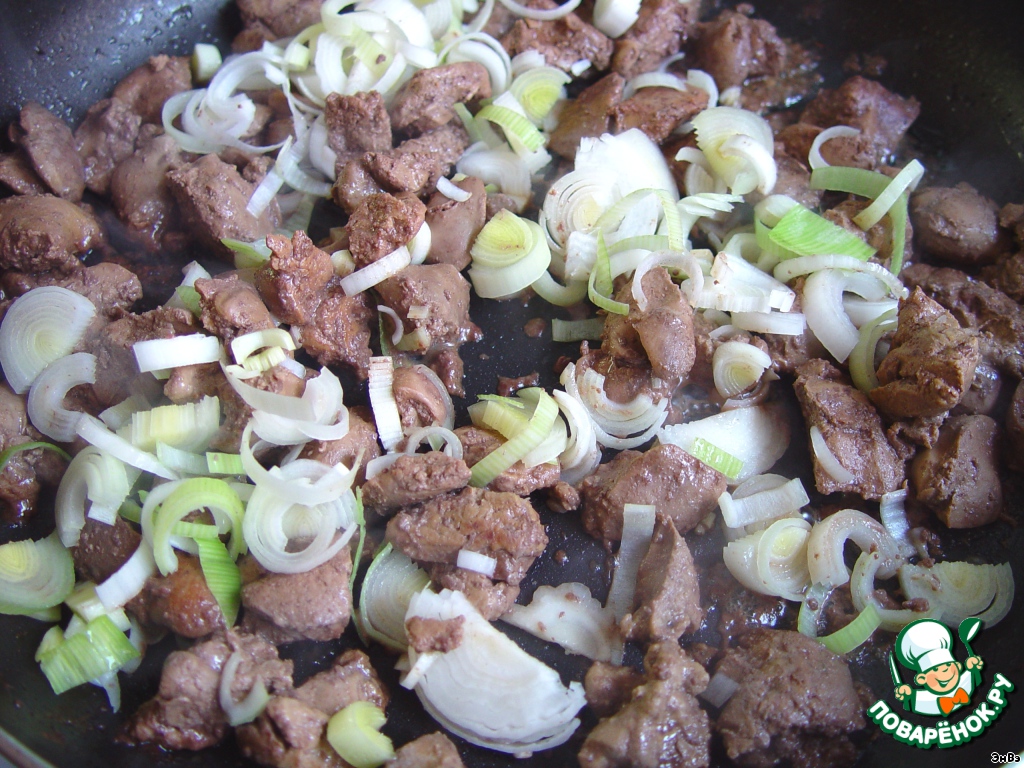 Готовую печень и порей солим, перчим и добавляем орегано (душицу; она приглушит специфический вкус печени и добавит интересную вкусовую нотку). Обжариваем все это до подрумянивания кусочков печени.