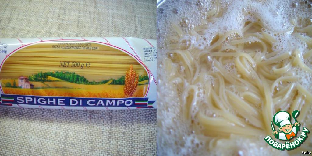 Готовим пасту. У меня была такая вот лапша. Варим ее, сцеживаем и возвращаем обратно в кастрюлю, где уже соединяем с кусочком растопленного сливочного масла.