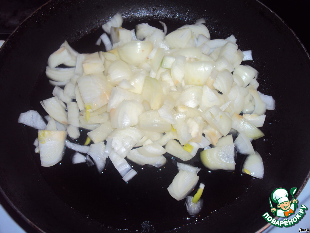 Чистим лук, режем его крупными кубиками и обжариваем отдельно до золотистого цвета.