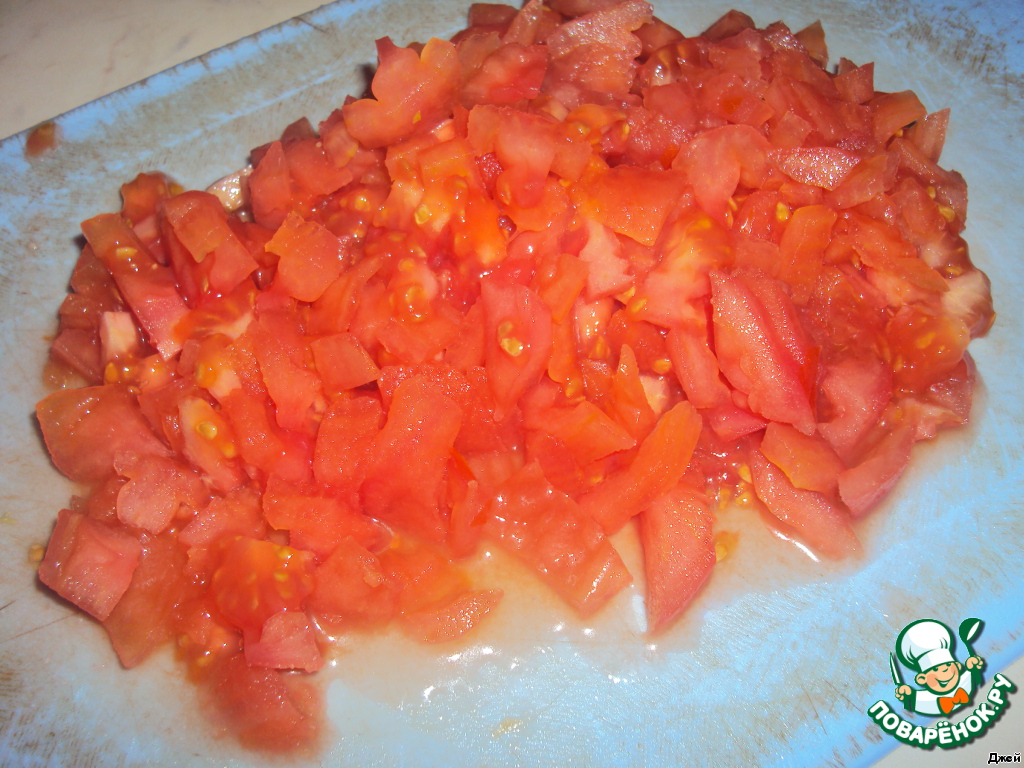 Помидоры ошпариваем кипятком, снимаем с них кожицу и мелко нарезаем.