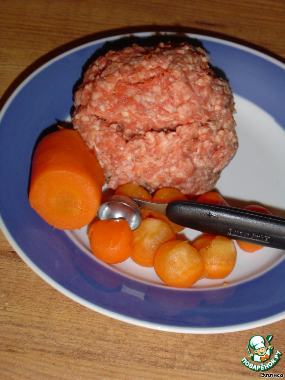 Начинаем с приготовления фрикаделек. Первым делом отвариваем морковь, очищаем и ложкой-нуазеткой (можно чайной ложкой) вырезаем шарики.