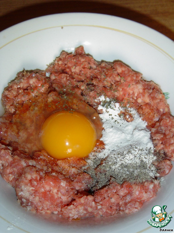 В фарш добавляем сухой лук, сухой чеснок, перец, соль, сухой укроп, яйца, и хорошенько вымешиваем.