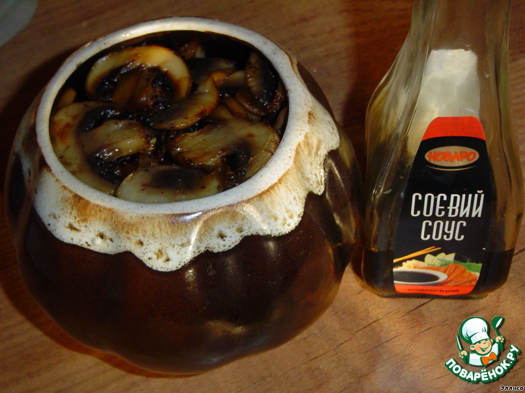 Следующий слой - грибы, сбрызгиваем соевым соусом.