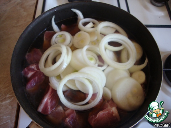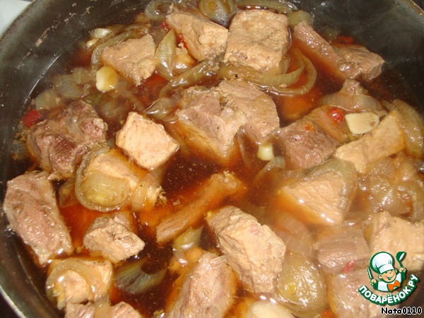 А сейчас в соус выкладываем мясо и лук. Перемешиваем.