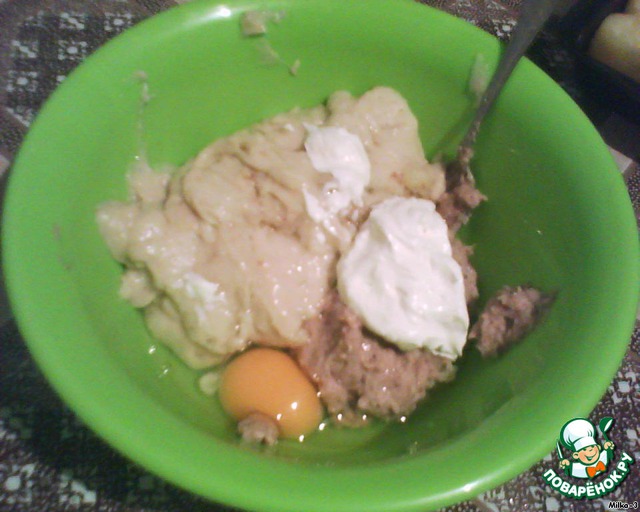 Добавить яйцо и сметану (1 ст.л.). Полученную массу взбить миксером.