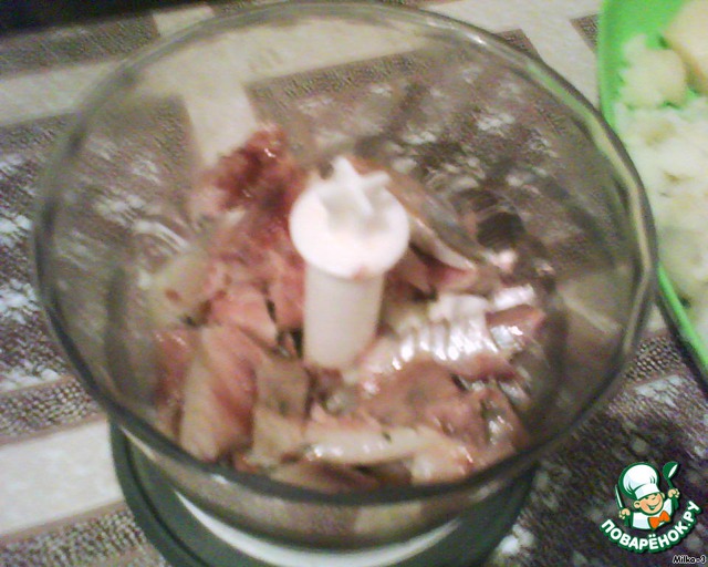 Филе сельди, лук и и картофель (остатки) прокрутить через мясорубку или в блендере.