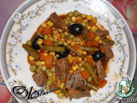 Достаём мясо с овощами, кладём в него маслины и специи. Ставим ещё минуты на 3.