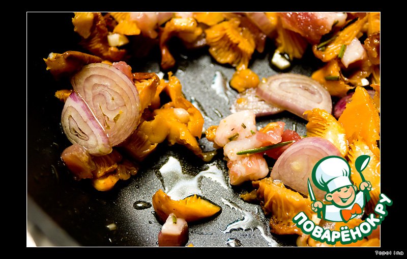 "А грибы?" — раздаeтся из-за компьютера плачущий голос мужа — "Какое блюдо по-охотничьи может быть без грибов? Я хочу грибы!!!" Грибов в рецептуре нет, но спорить с мужем сейчас дело гиблое, тем более, что какие-то свежие грибы неопознанной мною породы в холодильнике завалялись. Достаю их и тоже режу до кучи.