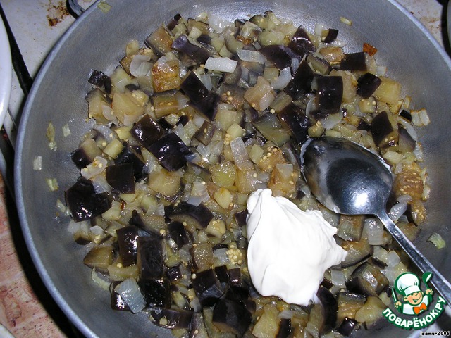 Когда синенькие прожарятся - протушатся, в общем станут мягкими, добавить сметанку, еще потушить минуты 3-5.