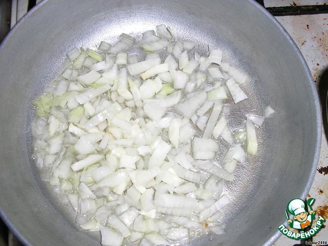 Синенькие очистить от кожуры и порезать кубиками (размер примерно как игральные кости). Если много косточек (семян)- вычистить насколько возможно. Добавить к обжаренному луку и жарить все вместе.