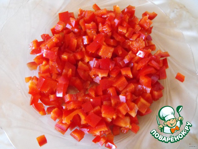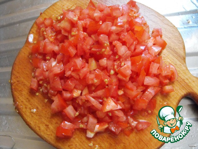 Помидоры мелко порезать, предварительно сняв кожицу.