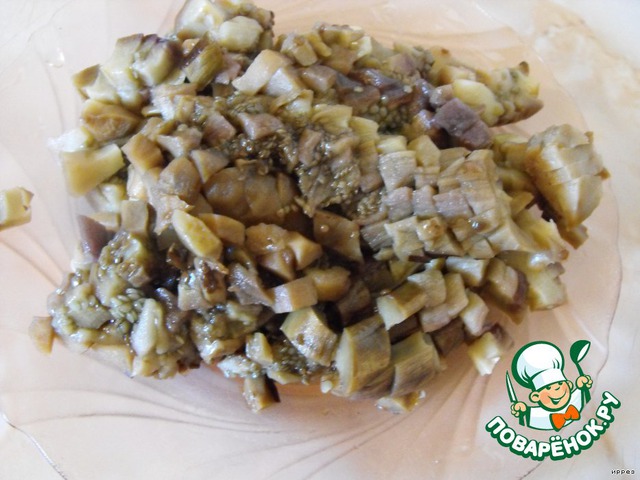 Дать остыть, аккуратно вынуть мякоть и нарезать кусочками.