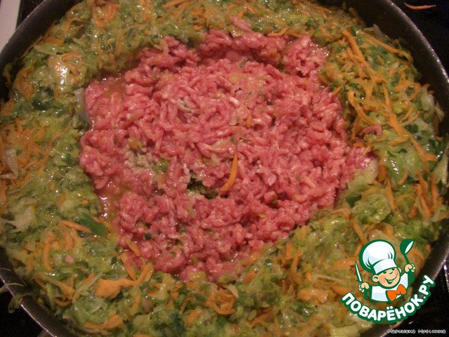 Затем овощи отодвигаем к краям сковородки и выкладываем на серединку фарш.