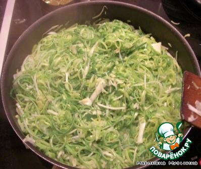 Нарезаем лук-порей и начинаем жарить на растительном масле