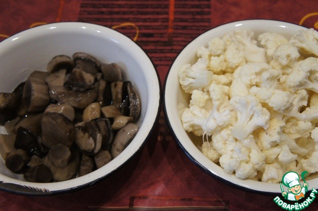 Капусту разделить на соцветия, грибы нарезать кусочками.