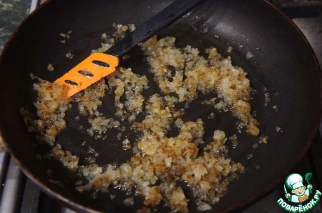Луковицу измельчить и обжарить в растительном масле до золотистого цвета.