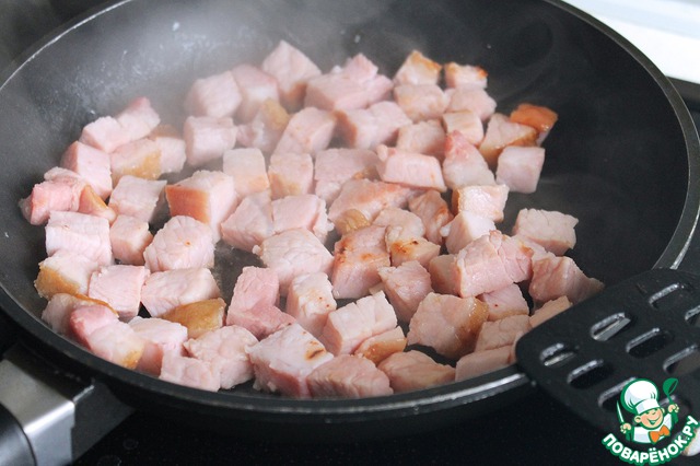 Обжарить до золотистых бочков (я прям без масла жарила на раскаленной сковороде, потому что жирка хоть и не видно особо, но он все же есть). После обжаривания мясо убрать в сторону, оно нам пока еще не пригодится.