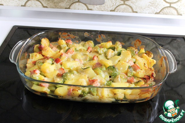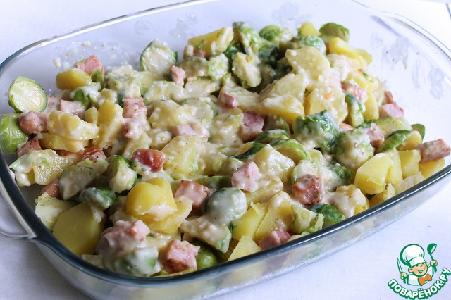 Когда овощи немного остынут, порезать картофель на крупные кусочки, капусту при этом можно оставить целой, а можно и разрезать. Выложить овощи и мясо в форму, залить соусом, перемешать. Теперь отправляем в прогретую до 180С духовку минут на 30 ;)
