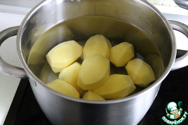 Картошку почистим и поставим вариться. Я думаю, что штук 6-7 среднего размера хватит (у меня немного больше потому, что купила я, блин, какую-то карликовую картошку). Картошку нужно брать ту, которая не разваривается и варить до готовности, а это минут 20 примерно.