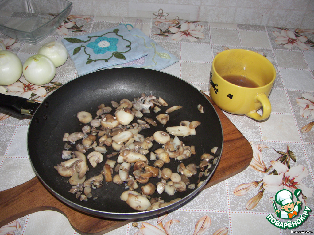 Шампиньоны нарезать пластинками, выложить в сковородку, добавить 1/2 стакана воды, соль. Потушить под крышкой 5 минут. Образовавшийся грибной «бульон» слить в чашку, не выливать! Выпарить воду из грибов.