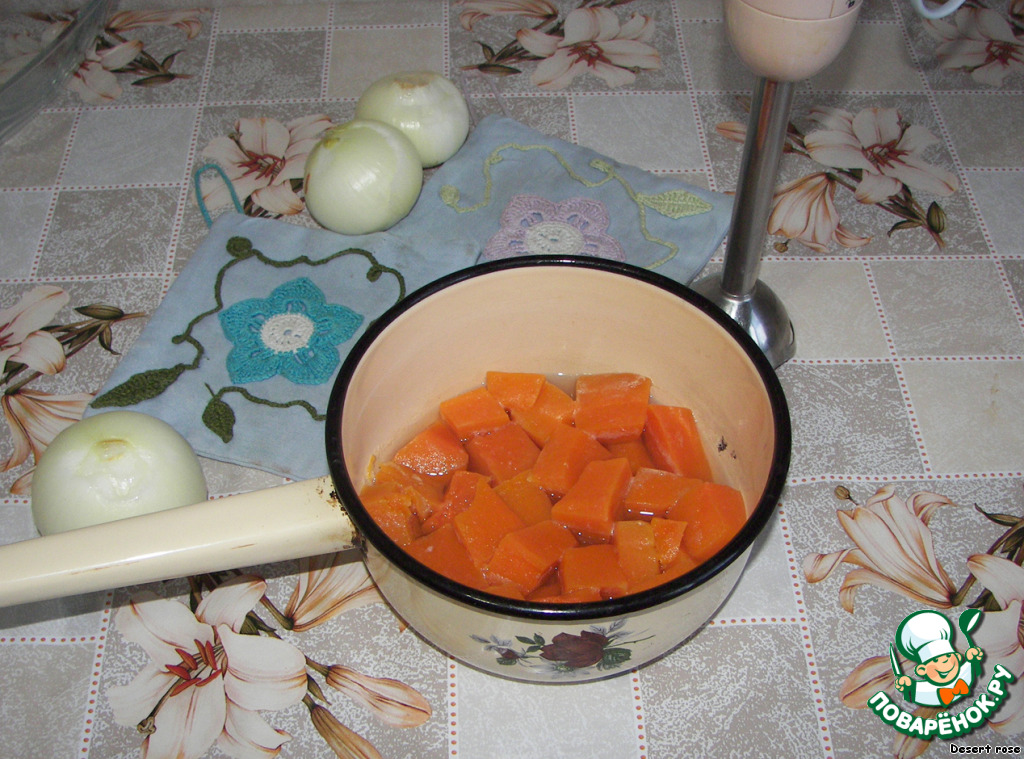 Тыкву нарезать кубиками, потушить с парой ложек воды до готовности. Добавить обжаренные пластинки чеснока, соль. Пюрировать погружным блендером.