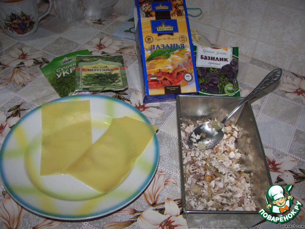 Начинки и соус готовы. Приступаем к сборке лазаньи. Отвариваем пластинки лазаньи в кипящей воде с щепоткой соли 3 минуты. Я отвариваю по две штучки одновременно, не больше. Обсушиваем на чистом полотенце. На дно подходящей глубокой формы кладем куриную начинку – мясо курицы и половину жареного лука. Посыпаем базиликом и тертым сыром, поливаем соусом. Кладем пластинки лазаньи.