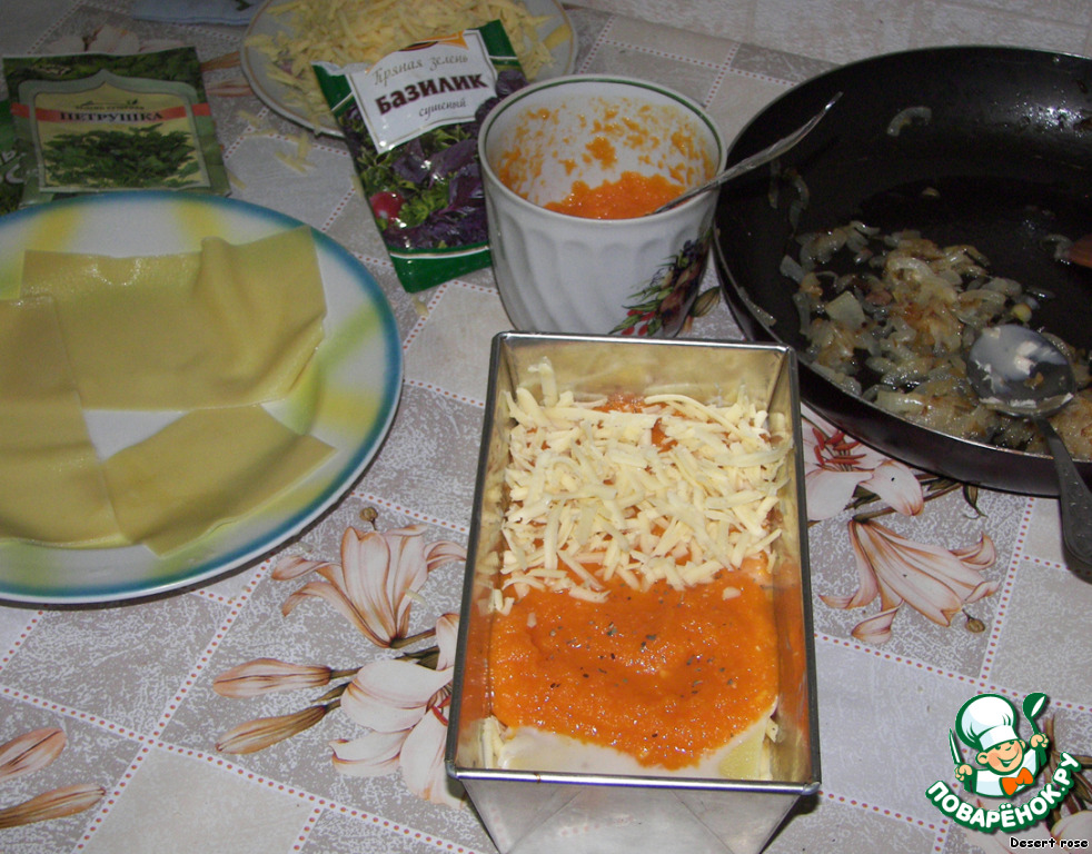 Затем кладем тыквенное пюре, посыпаем базиликом и сыром. Этот слой полить соусом слегка, так он достаточно влажный из-за тыквы. Кладем пластинки лазаньи.