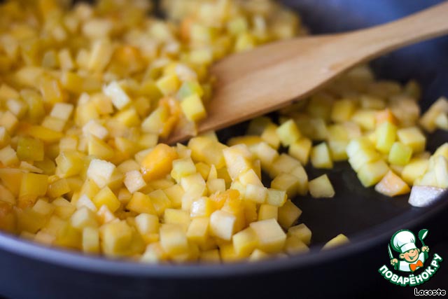 Тыкву нарезать на маленькие кубики. Обжарить.