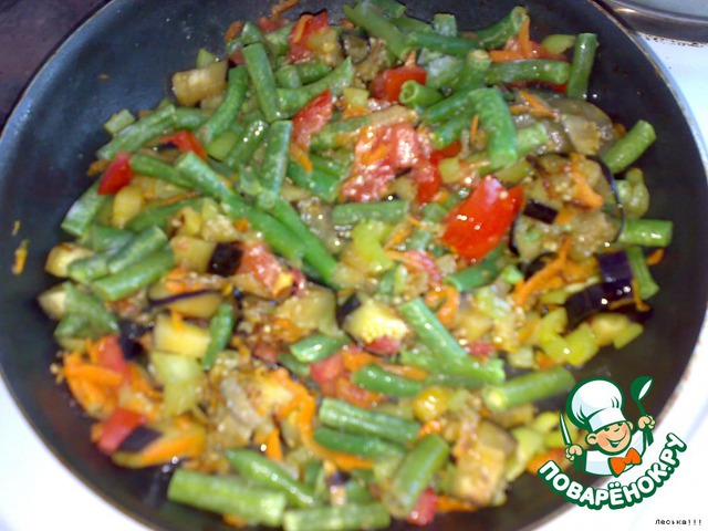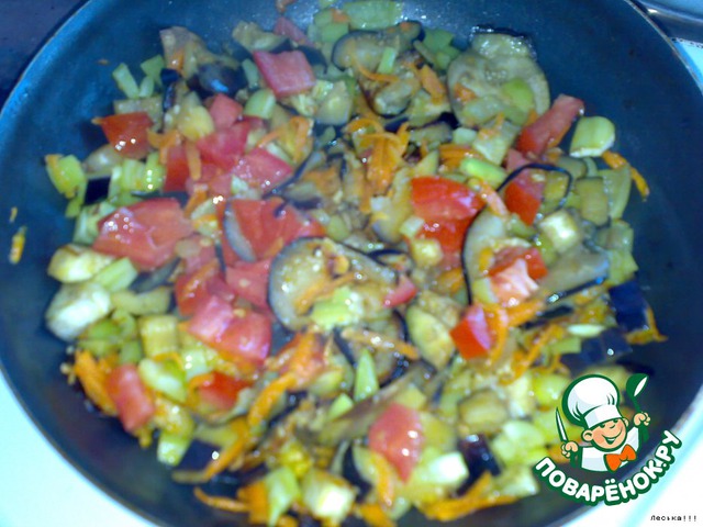 Баклажан режем кубиками, морковь трем на терке, перец режем кусочками, помидор мелкими дольками. Ставим обжариваться на растительном масле, до полуготовности.