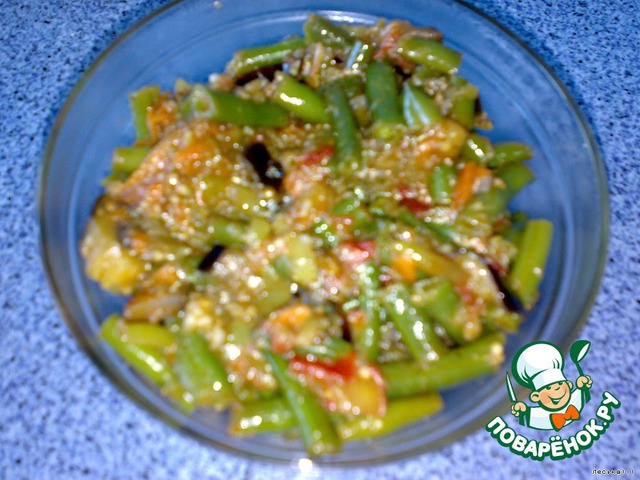 Затем добавляем фасоль замороженную. Чеснок пропускаем через чеснокодавилку, солим, перчим. Я добавила еще молотый имбирь, мускатный орех.