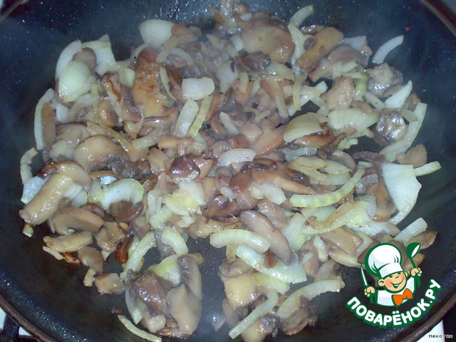 Замороженные грибы растопить на сковороде без масла, когда вода выпарится, добавить кусок сливочного масла, порезанный четверть кольцами лук и посыпать базиликом. обжарить до золотистого цвета. подсолить немного.