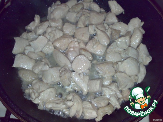 Обжарить в растительном масле порезанное куриное филе. До побеления мяса. сильно жарить не надо. посолить, посыпать перцами.