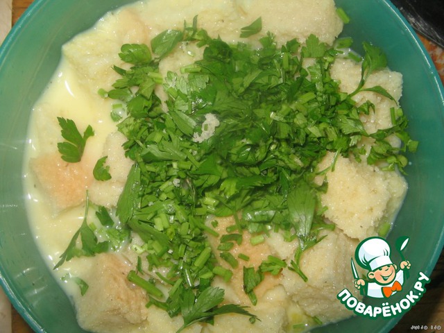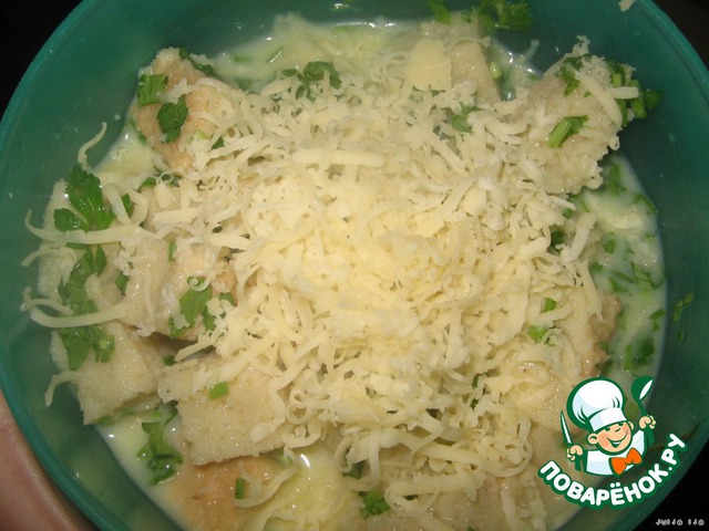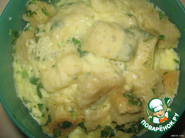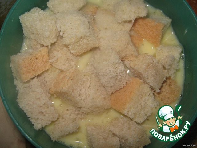 Нарезаем хлеб кубиками, и кладём его в смесь.