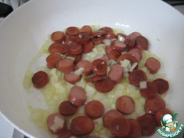 Сосиски порезать кружочками. В глубокой сковороде разогреть оливковое масло, обжарить сосиски до румяной корочки. Лук порезать мелко, добавить к сосисками, готовить 5 минут, постоянно помешивая.