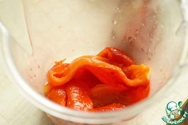 1. Перец запечь в духовке до подпалин, положить в пакет на 10 минут. Затем очистить кожицу, убрать семена, переложить в чашу блендером и пюрировать.