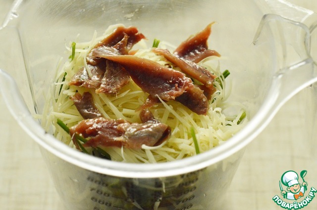 2. Для соуса в чашу блендера выложить петрушку, пармезан и анчоусы, пробить блендером, по- немногу подливая масло.