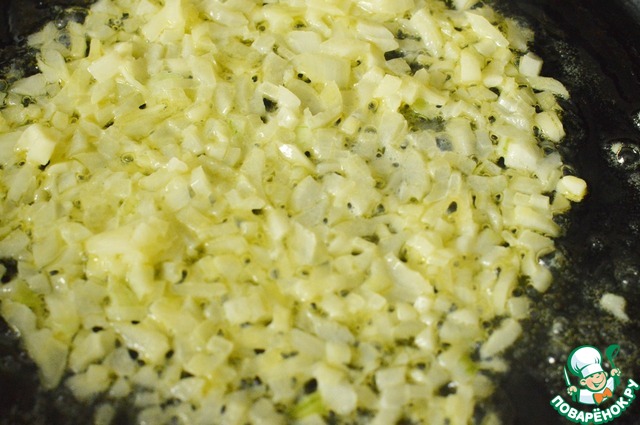 3. Лук нарезать мелким кубиком. В сковороде растопить сливочное масло (20г), добавить оливковое и обжарить лук до прозрачности.