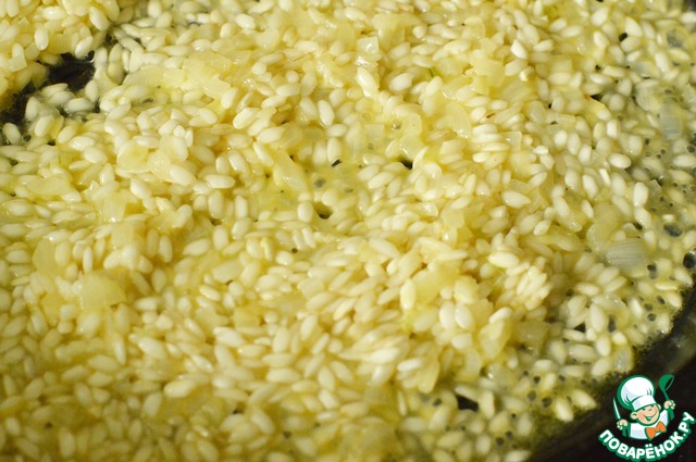 4. Затем в сковороду всыпать рис, и обжаривать до полу прозрачности риса.